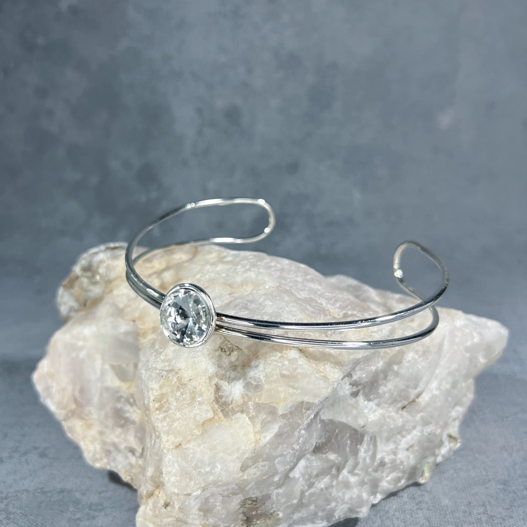 Diseñada en bronce, Enchapada en Plata 925 y acompañada de strass de vidrio de color tallado a maquina, se amolda al cuello con un simple movimiento de apertura y cierre. (Es ajustable)